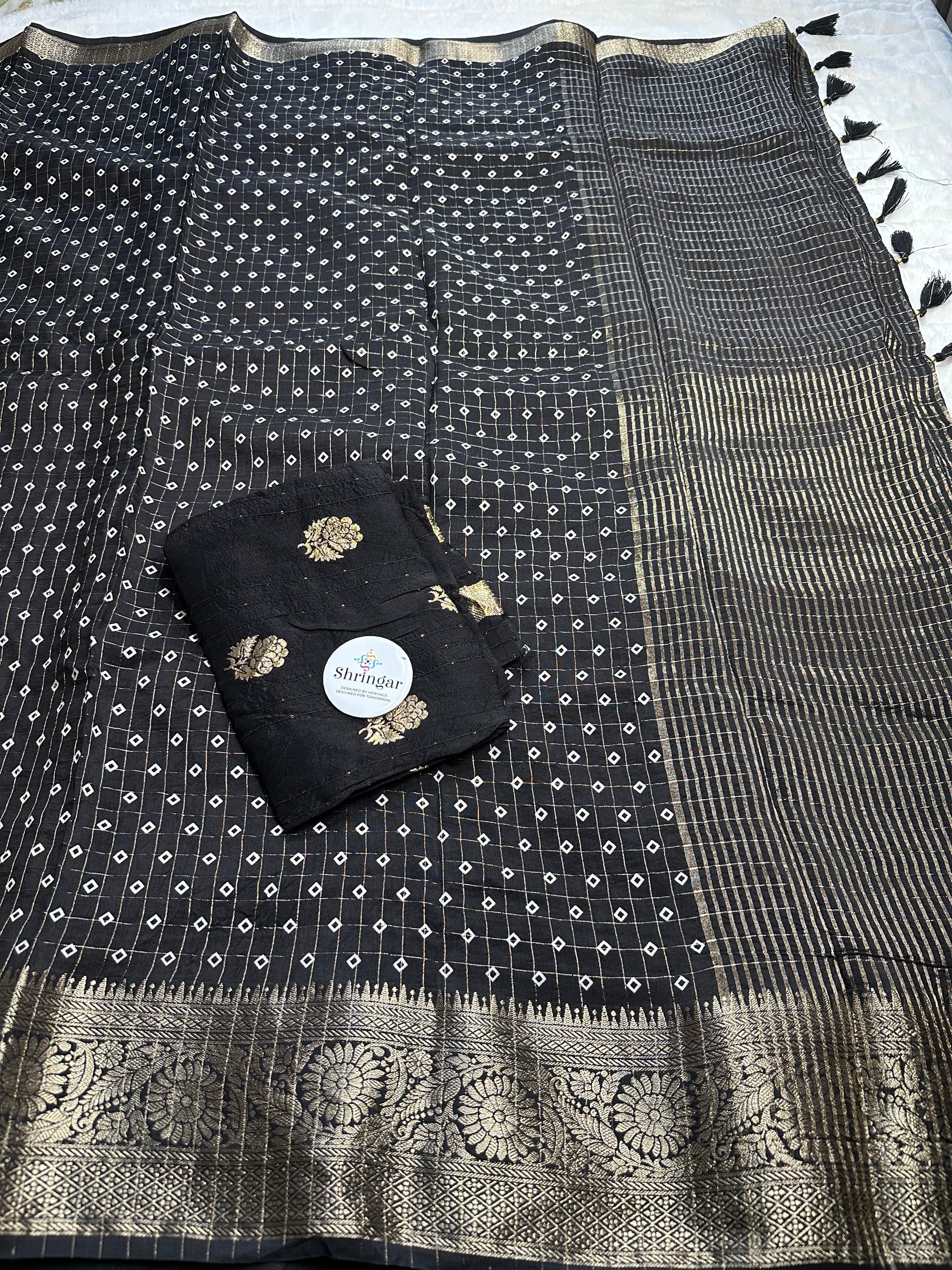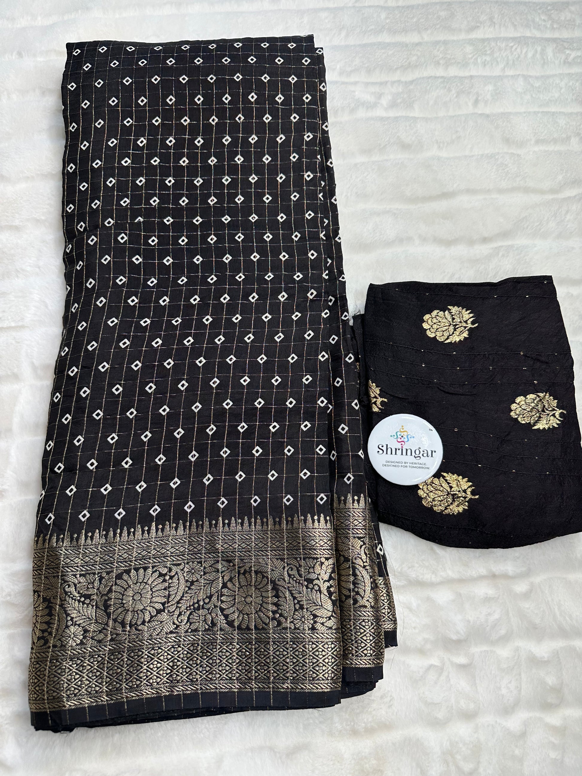 • Blouse Piece: Comes with a matching black unstitched blouse piece featuring gold floral buttis to complete the coordinated look.