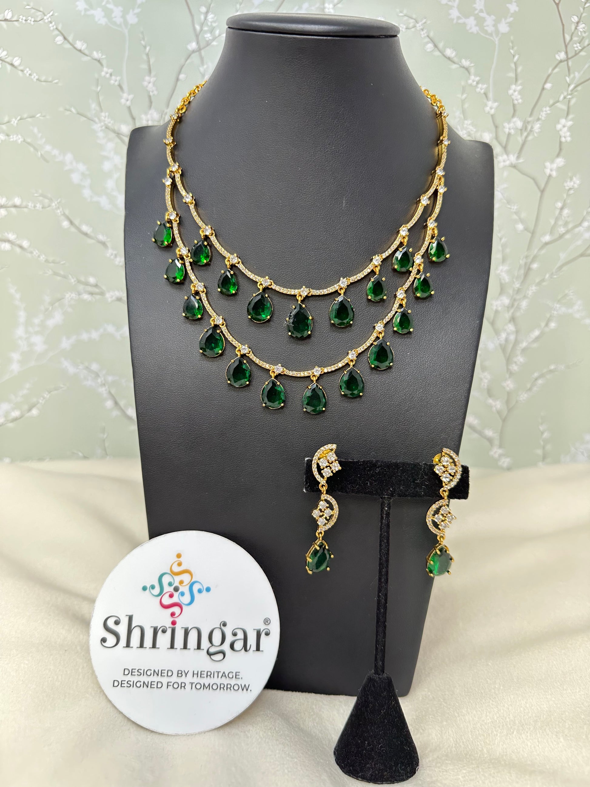 Emerald 2 Layered Necklace Earrings Set
