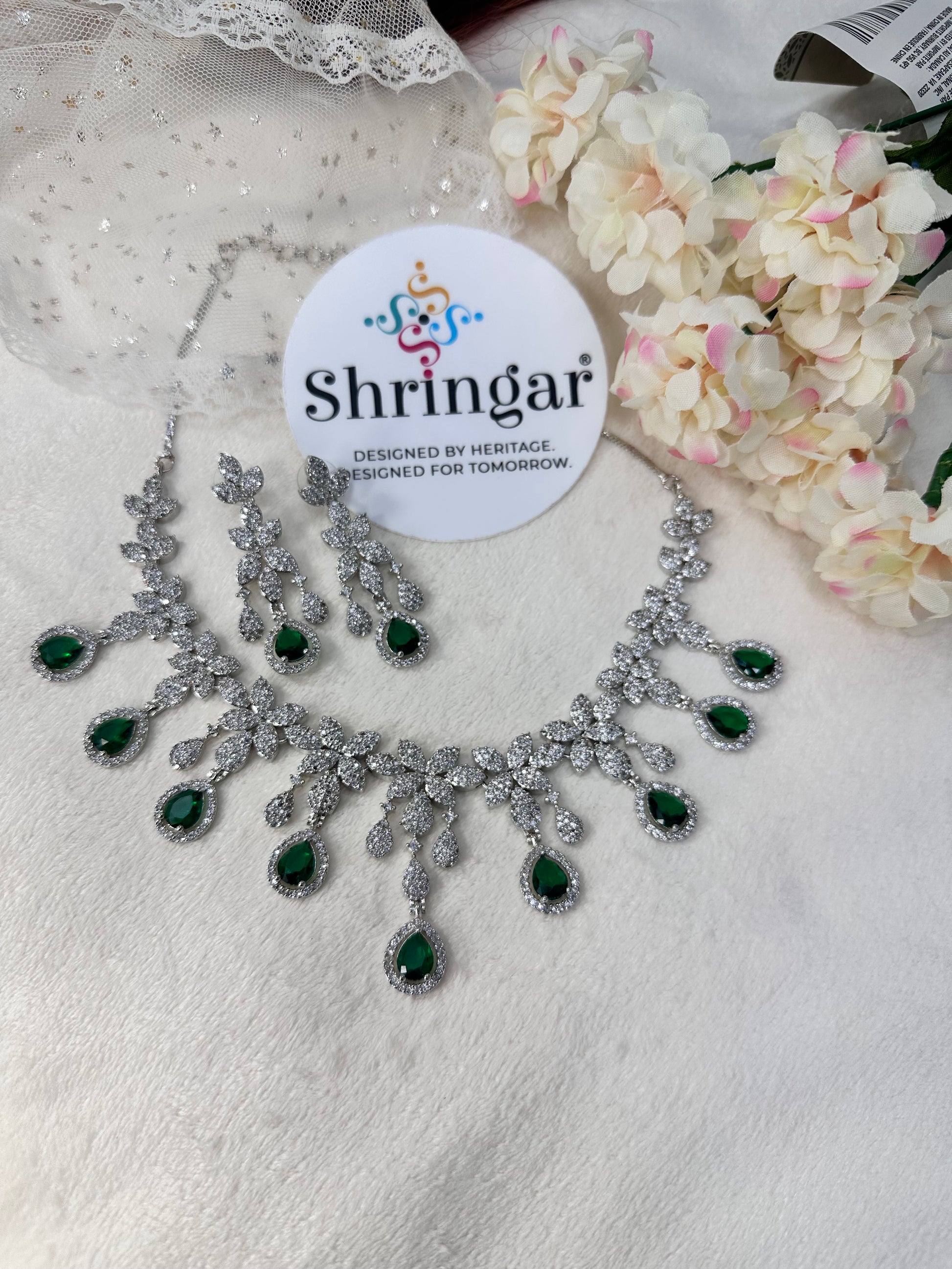 The set features a high-shine silver-toned base intricately set with shimmering white stones. The primary focal points are the vibrant, emerald-green pear-cut stones that provide a rich contrast against the brilliant white sparkle.