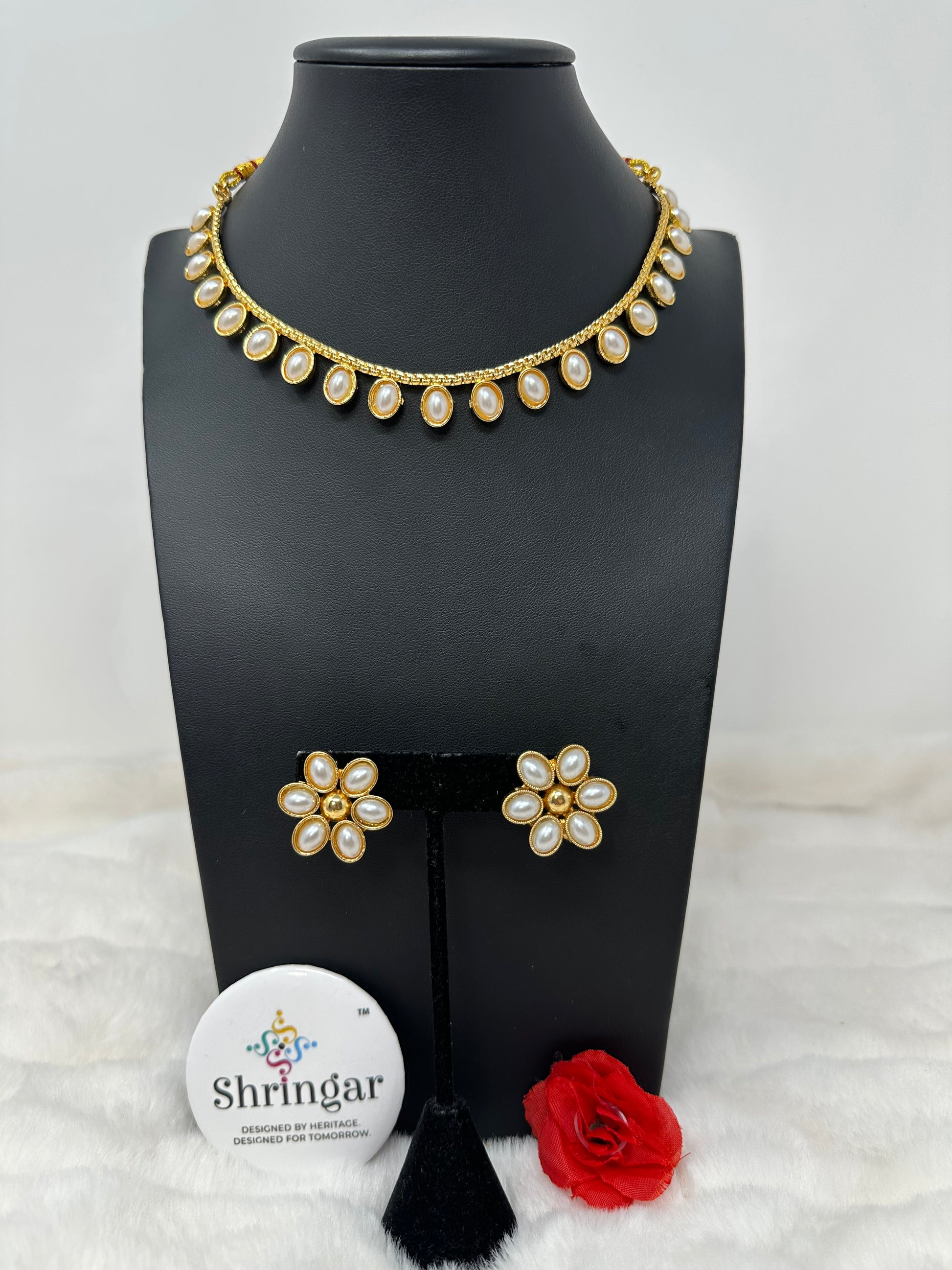 Featuring a delicate choker-style necklace adorned with a symmetrical row of polished oval pearls and Flo studs.