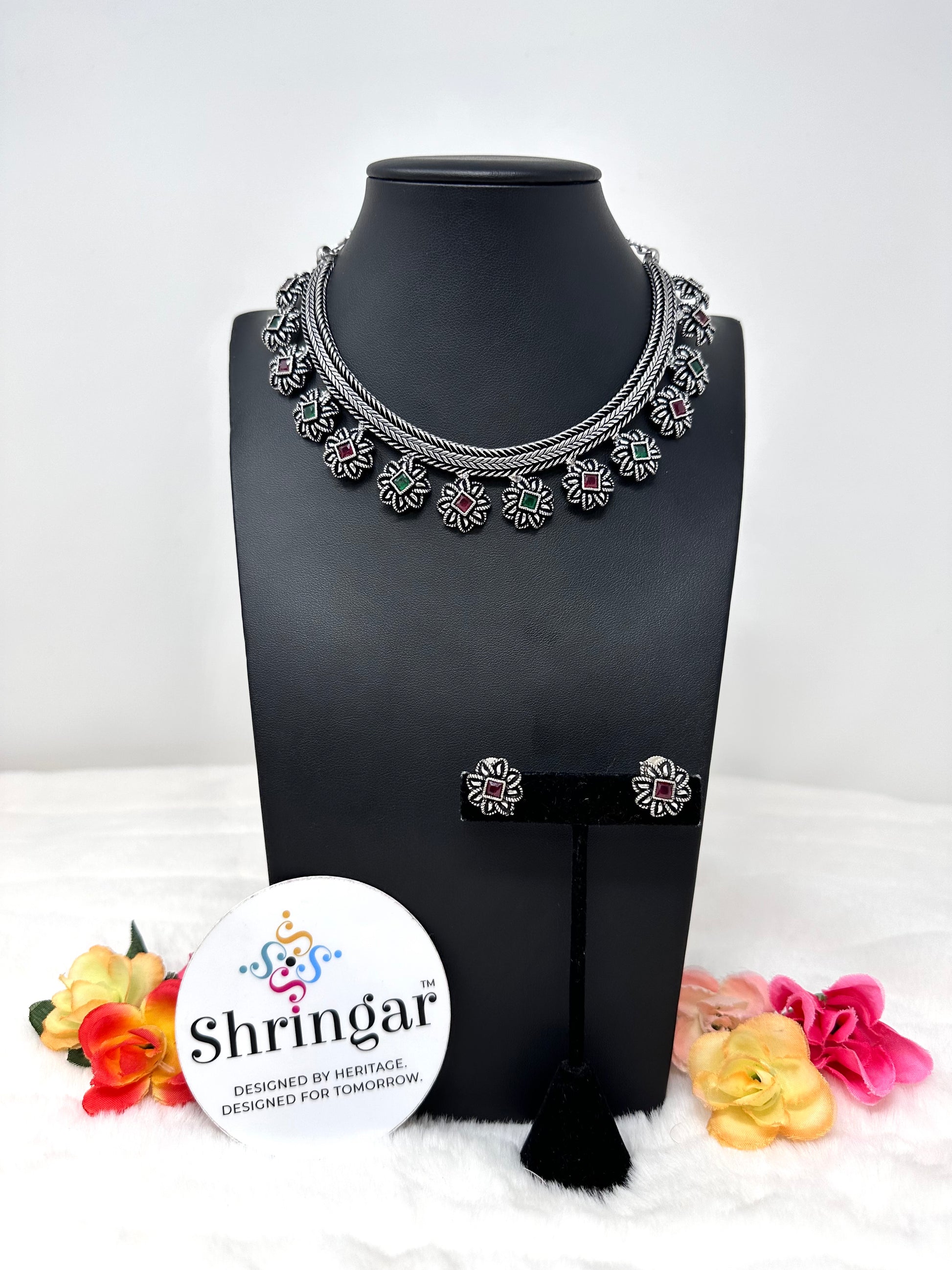 Add a pop of color to your look with our Oxidized Necklace Set! This stunning set features a floral design with pink and green stones, and comes with matching earrings.