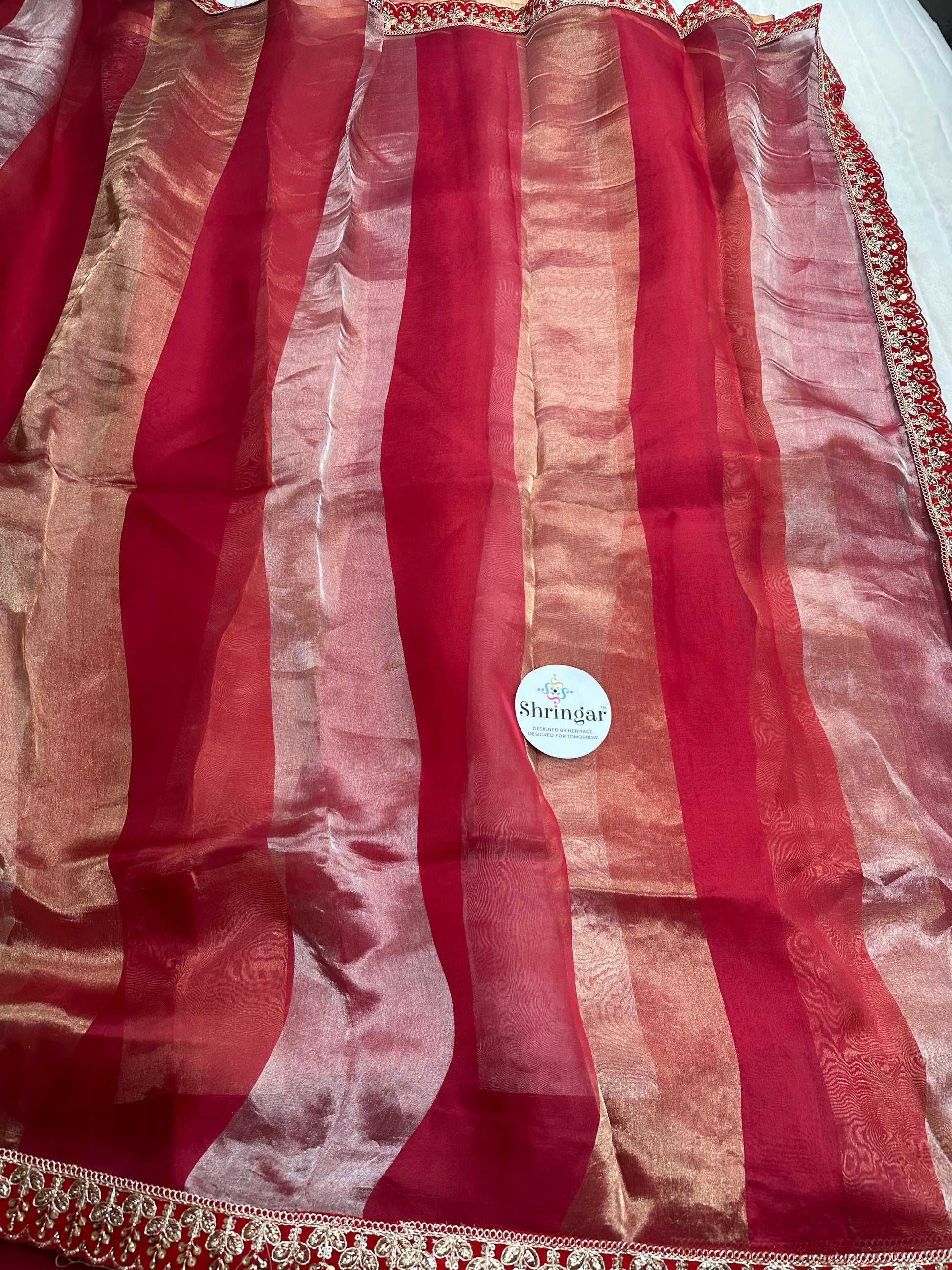 • The Fabric: Crafted from premium Tissue Silk, known for its signature translucent shimmer and lightweight, crisp drape that holds its shape beautifully.