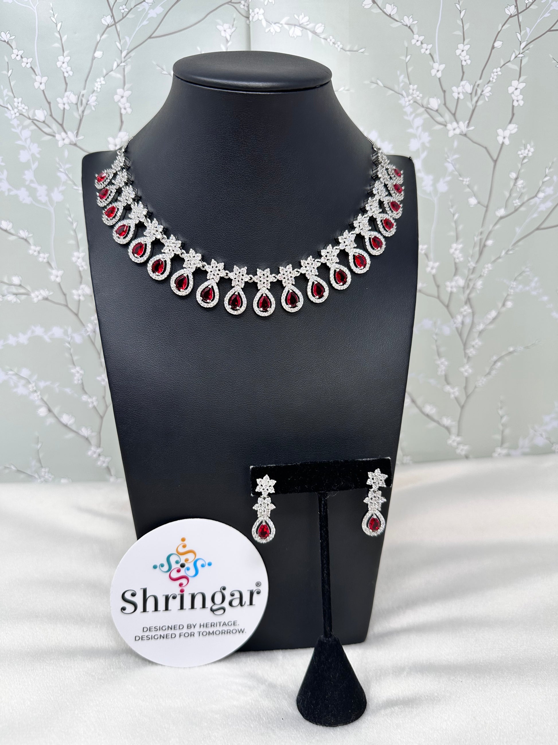 Perfectly coordinated drop earrings that mirror the necklace's central design. They feature a floral stud at the top leading down to a single, elegant pear-shaped red stone.