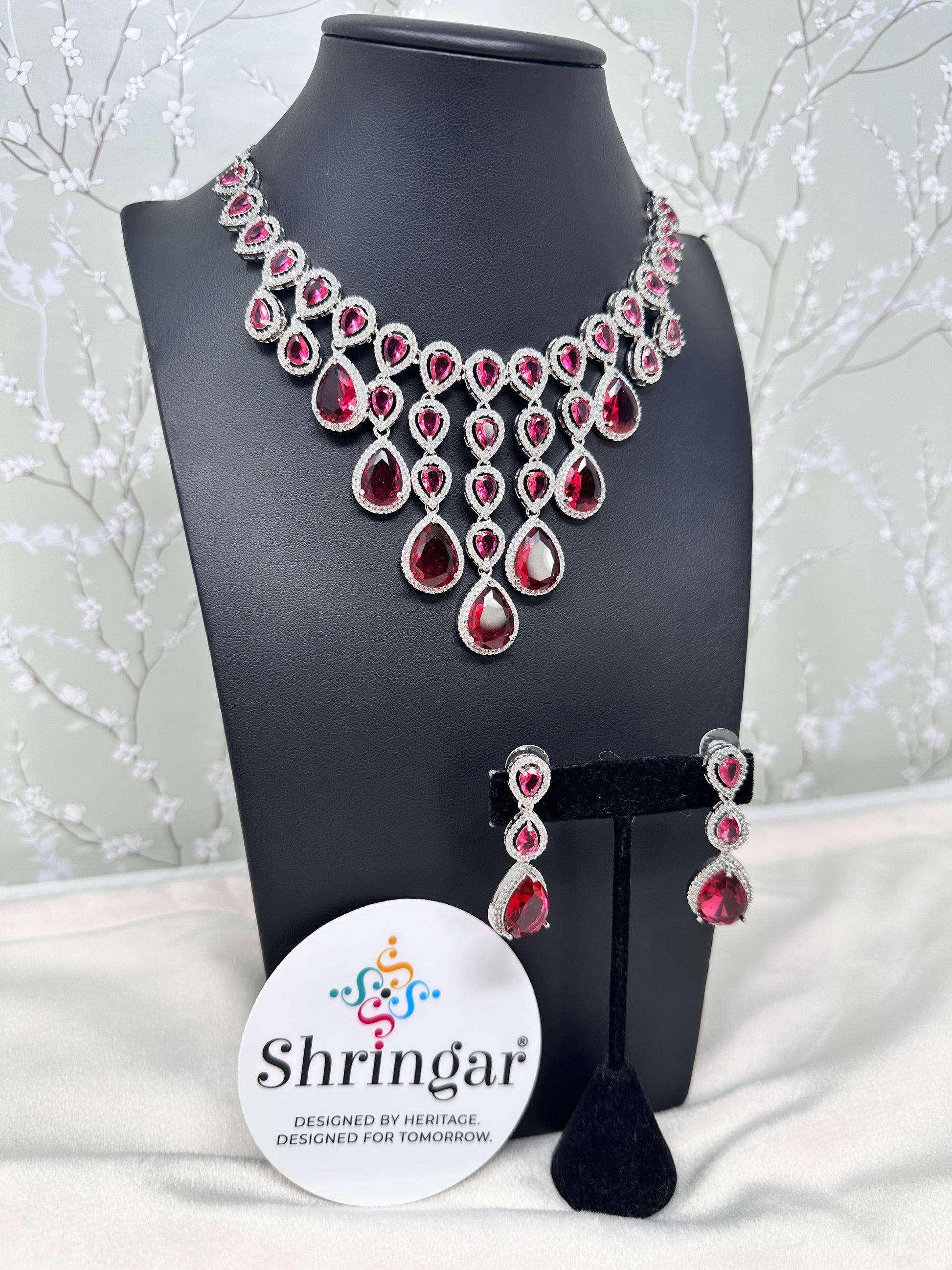 The set is adorned with high-quality, teardrop-cut stones in a rich maroon/ruby hue. Each major stone is encased in a halo of shimmering white pavé crystals (American Diamond/Cubic Zirconia style) to maximize light reflection.